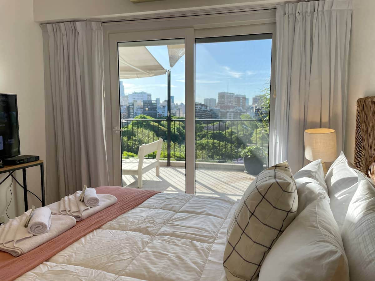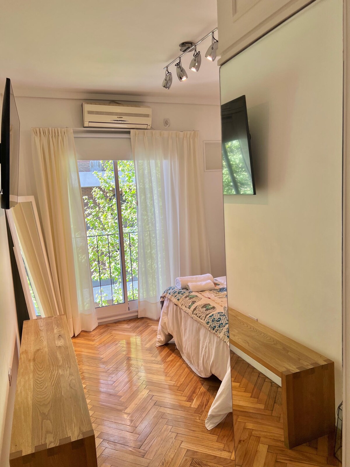 Wake up with the beautiful green view of the trees in the background, in this warm and comfortable apartment in the lively neighborhood of Palermo, surrounded by museums, shops, supermarkets and plenty of nice restaurants/bars to have a drink at sunset...With an unbeatable location it is an excellent starting point to visit the different neighborhoods of Buenos Aires. Building with security 24h/day. Internet speed 100 Mbps The apartment is cleaned with extra precautions and sanitized thoroughly. Apartamento de 50 m2 con vista verde, con balcón, en el corazón de Palermo. Tiene 1 dormitorio con cama matrimonial y 1 sillón cama de 1 plaza en el living. Black out en dormitorio y living. Posee caja de seguridad. Excelente ducha. Equipado con Internet Wi-Fi, posee 2 TV : una de 42" en el living y otra de 32" en la habitación con Netflix, 2 aires acondicionados, calefacción, microondas, tostadora, 1 gran heladera, cafetera y termo eléctrico, tender extensible para el secado de la ropa, plancha y tabla de planchar. El departamento ha sido reformado en mayo 2016, esto incluye pisos nuevos, colchón nuevo de alta calidad así como ropa blanca. En diciembre 2016 se colocó una cocina nueva, eléctrica. Me encuentro disponible en el celular para cualquier solicitud, consulta o recomendaciones sobre la ciudad de Buenos Aires o sobre el departamento. Apartment located in a safe and lively area, with a fantastic location that includes green spaces and an important gastronomic and cultural center very much appreciated of the city. Near the main cultural and touristic attractions. Steps from all means of public transport. Walking distance to Malba Museum. Only 10' from the Jorge Newbery National Airport. Ubicación muy práctica para moverse en BA con todos los medios de transporte públicos a 3 cuadras en Av.Las Heras y a 1 cuadra en Av.Libertador. Personas adicionales sin cargo. Se hace una limpieza general por semana con cambio de ropa blanca sin cargo. El departamento tiene puerta blindada y abajo en la recepción hay guardias de seguridad las 24h. Posee caja de seguridad.