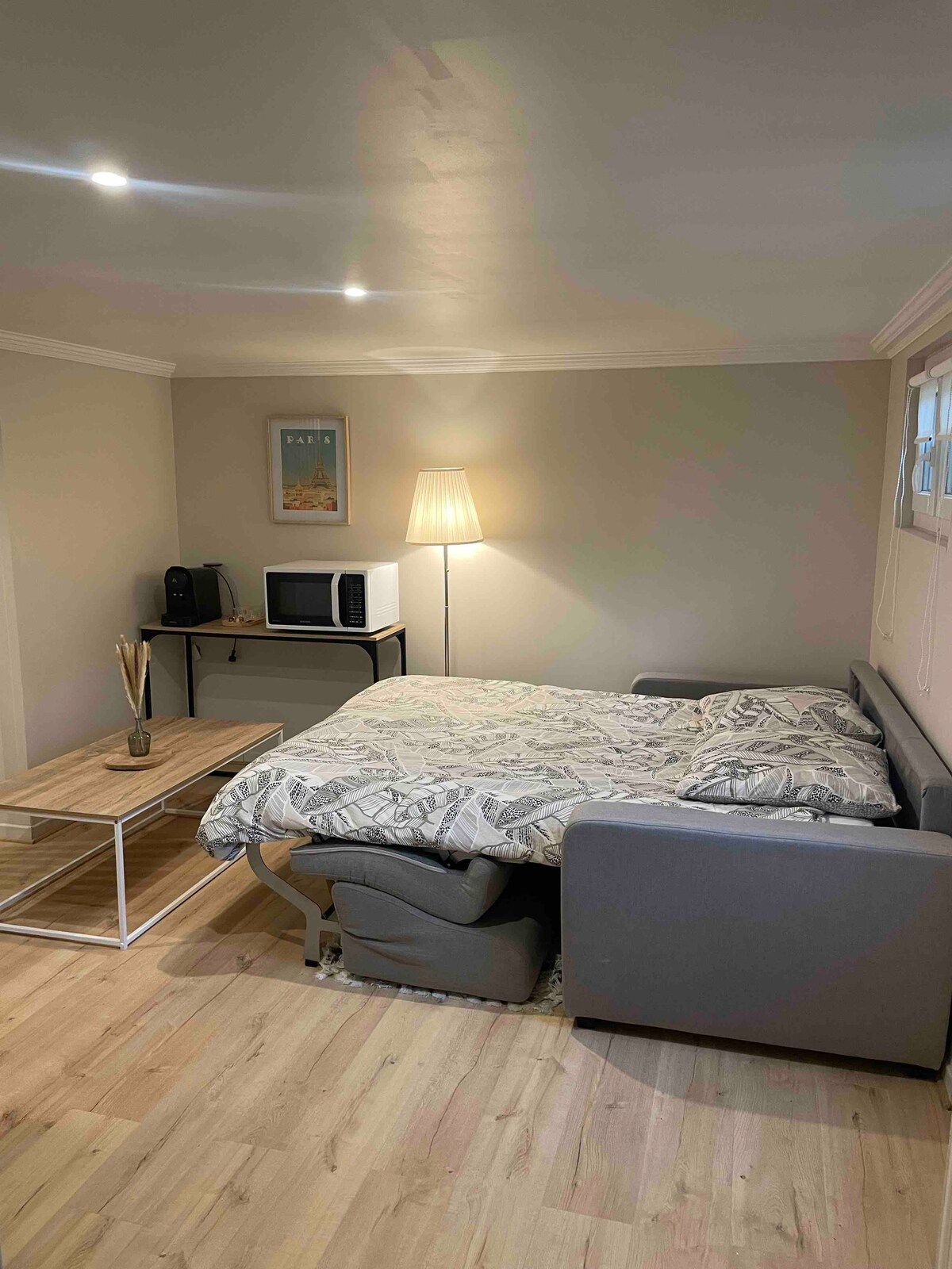 Ilus hubane stuudio, kust avaneb vaade suurele aiale. Majutus asub väga hea asukohaga 5-minutilise jalutuskäigu kaugusel rongijaamast, 25-minutilise jalutuskäigu kaugusel Pariisist. Supermarketid, pagariärid ja kauplused 3-minutilise jalutuskäigu kaugusel. Majutusasutuses on suur diivanvoodi kahele inimesele, vannituba duši ja WC-ga, kirjutuslaud, panipaik, garderoob. Wifi on komplektis. Kööginurk külmkapi, sügavkülmiku, mikrolaineahjuga. töölaud kahe tooliga.