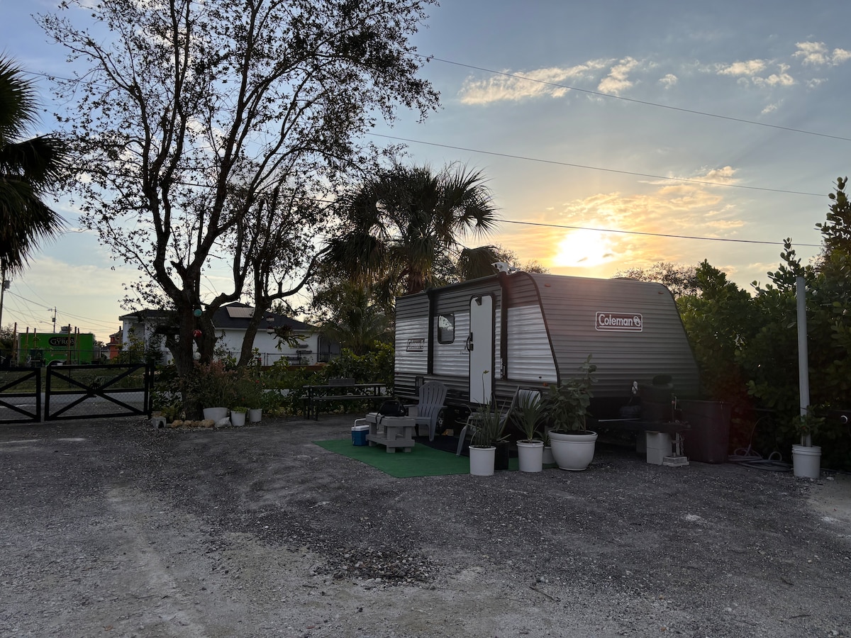 Come Glamping in this luxurious 2022 RV. Nestled in our large historic lot with your own private space with WIFI and smart TV w/ all ur fav streaming aps. Outdoor area w/ bbq, fridge and plenty of room to relax. Experience the up and coming Gardeners Park neighborhood 5 BLOCKS FROM downtown Fort Myers!!! Walk to your favorite coffee shop in the AM get a slice from DHOP for lunch. One block from Bullig Bites, Remedies Parlor, Wisteria Tea room, Swamp Cat Brewery .