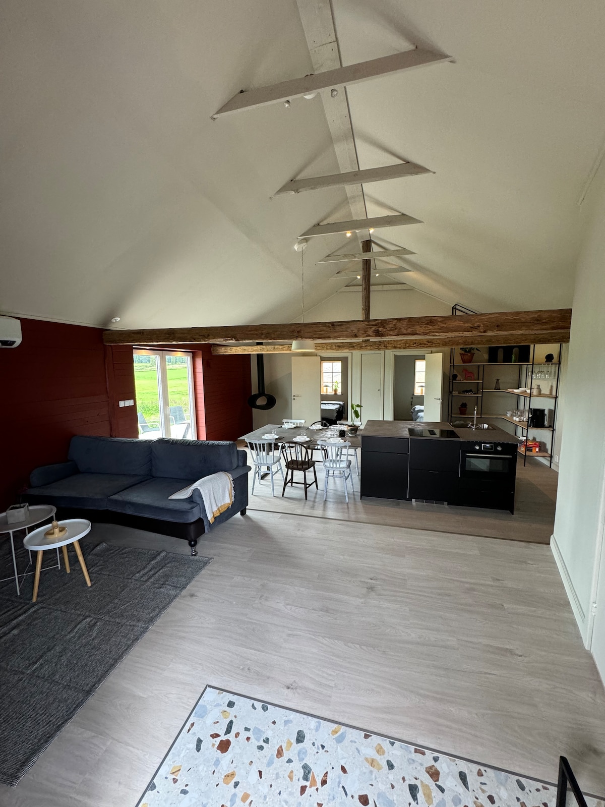 Our cosy guest house has its own entrance and is located in the same building as our garage on our spacious yard. By car it is 20 minutes away from the city Jönköping and the E4. Downstairs there is a small pentry, a kitchen table and toilet. Upstairs there is one double bed and two single beds. Note that bed sheets and towels are not included but can be rented for 100 SEK per person. Pillows and duvets are included.