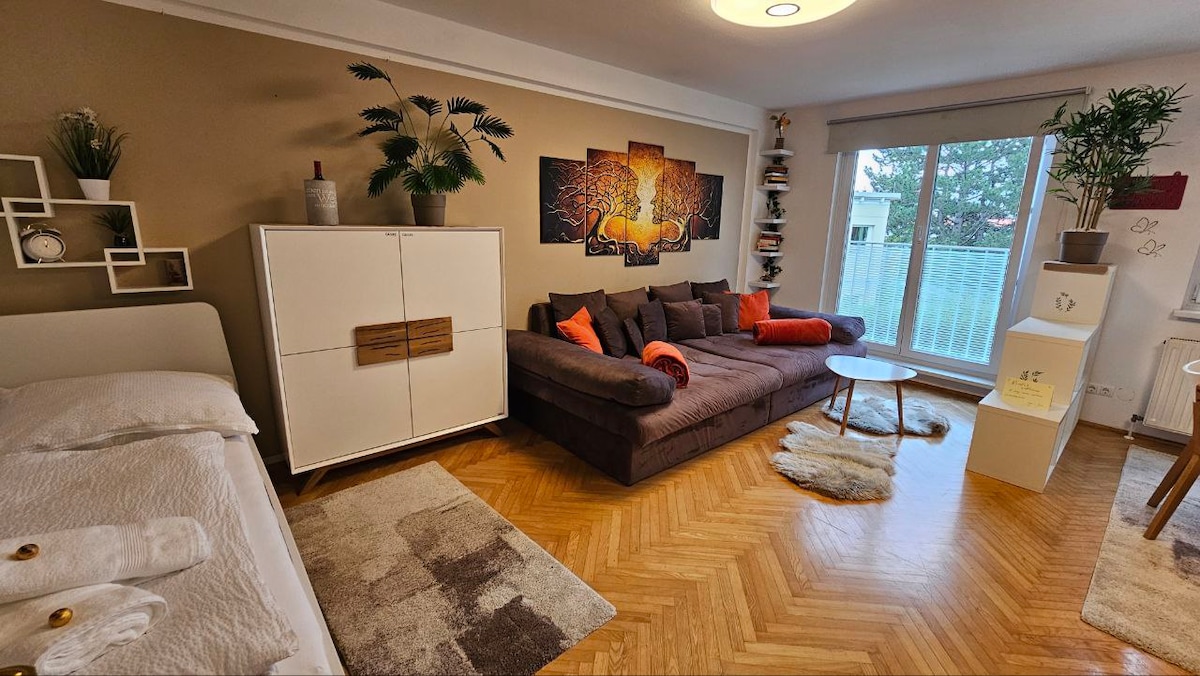 Ühetoaline korter Viinis – ideaalne paaridele ja ärireisijatele Tere tulemast meie valgusküllasesse ja mugavasse korterisse, mis sobib ideaalselt 1-2 inimesele. Pole vahet, kas otsid ajutist kodu või vaikset töökohta, meie stuudiokorter pakub kvaliteetseid mugavusi ja stiilset õhkkonda. Meie stuudio algupärane kunstiteos annab majutuskohale ainulaadse võlu ja kunstiarmastavad külalised saavad soovi korral külastada lähedalasuvat stuudiot.