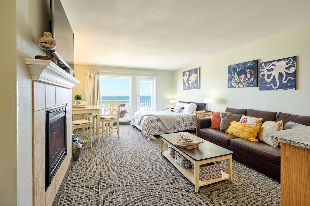 Warm coastal moments await in this oceanfront studio, where winter waves and quiet evenings shape an easy, relaxing stay. Designed for comfort and simplicity, everything is set up for peaceful time by the water. - Sleeps 2 | Studio | 1 bed | 1 bath - Oceanfront w/ private beach access - Private hot tub (year-round) - Electric fireplace & central heating - Full kitchen & dining for two - Private patio or balcony w/ BBQ