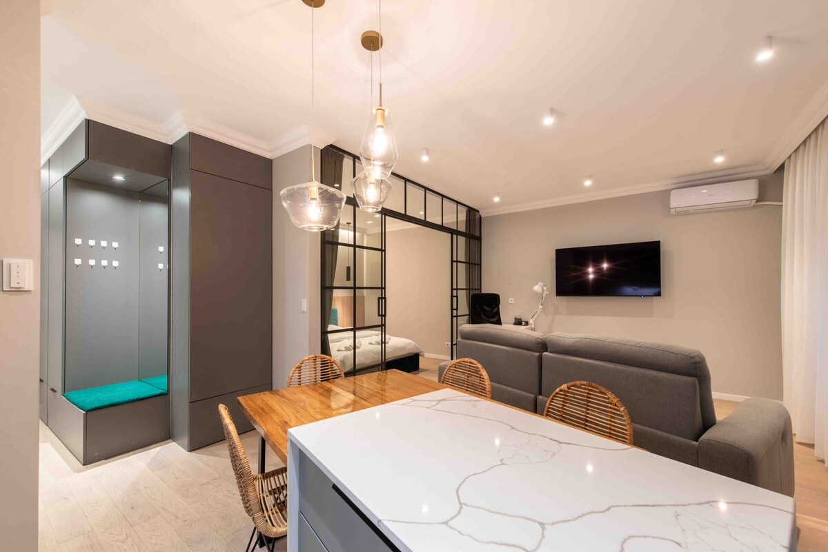 Relaxează-te în acest spațiu calm și elegant. Apartamentul este compus dintr-un dormitor cu pat matrimonial, un living cu canapea extensibilă, smart TV cu Netflix inclus, birou, loc de luat masa, baie cu duș, bucătărie echipată cu veselă, mașină de spălat vase, mașină de spălat haine, cuptor cu microunde, cuptor electric, cafetieră. Apartamentul este dotat cu aer conditionat și se află la etajul 4.
