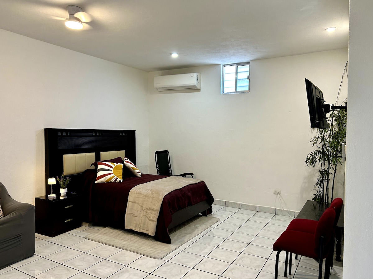 Departamento entero, en recámara tiene cama King Size y 2 sofá cama, aire acondicionado frio/calor, TV, closet y cajoneras. Además, tiene exclusivamente para ti: sala con 2 sofá cama, baño completo, barra comedor, cocina (con refri, estufa, micro ondas, horno, cafetera, nutribullet, sartenes, platos, etc.) Wi-fi rápido de 80MB, TV en sala.