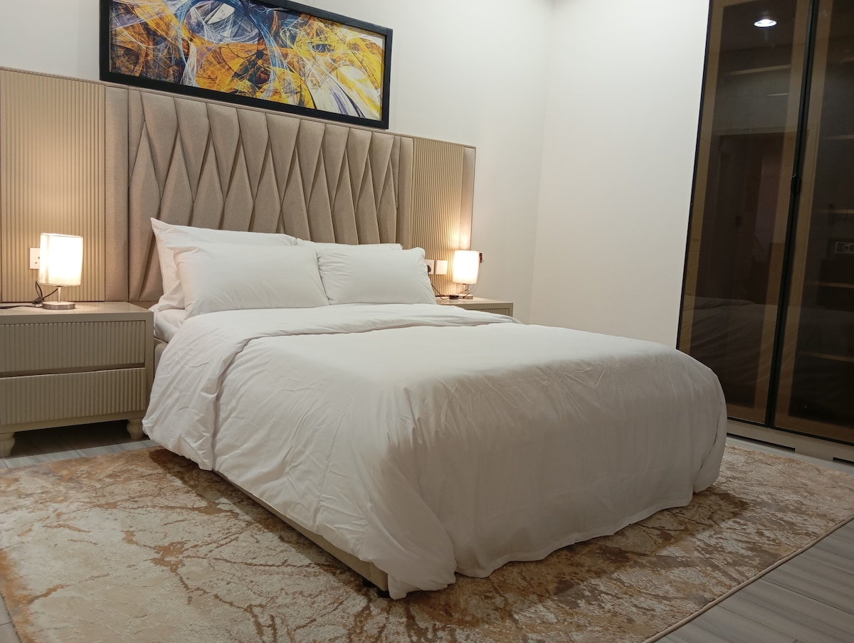 Naudi luksuslikku ja mugavat peatumist kaasaegses korteris ja erakordses asukohas: •2 elegantset magamistuba: magamistuba mugava eriti laia voodiga ja teine tuba kaheinimesevoodiga peredele • Avar puhketuba lõõgastava atmosfääriga • Praktiline teeninduslaud mikrolaineahju, külmiku ja kohvimasinaga. • teleri ekraani suurus meeldiva vaatamiskogemuse tagamiseks •Kaasaegne ja puhas WC-pott kvaliteetsete seadmetega. • Nutikas sissepääsusüsteem lihtsaks ja turvaliseks peatumiseks Asukoht: 5 minuti kaugusel Al Rashedi ostukeskusest 4 minutit hooajalist transporti 9 minuti kaugusel Al-Haramaini rongist