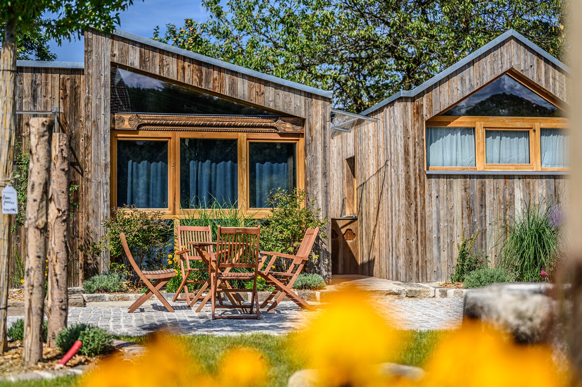 Genieße im autarken Tiny Haus die Natur und den sensationellen Ausblick Richtung Traunstein, Grünberg und in die Ferne. Versuche dich in einem nachhaltigerem Lebensstil, indem du die Ressourcen bewusst nutzt. Unsere Hühner und 4 Zwergesel sind im Hang unterhalb/neben dem Tiny Hause angesiedelt. Im Tiny Haus erwartet dich eine Küchenzeile, ein Bad mit Dusche, ein Loft mit Doppelbett sowie eine ausziehbare Couch im Wohnraum. Vor dem Haus kannst du gemütlich ausspannen und die Sonne genießen.