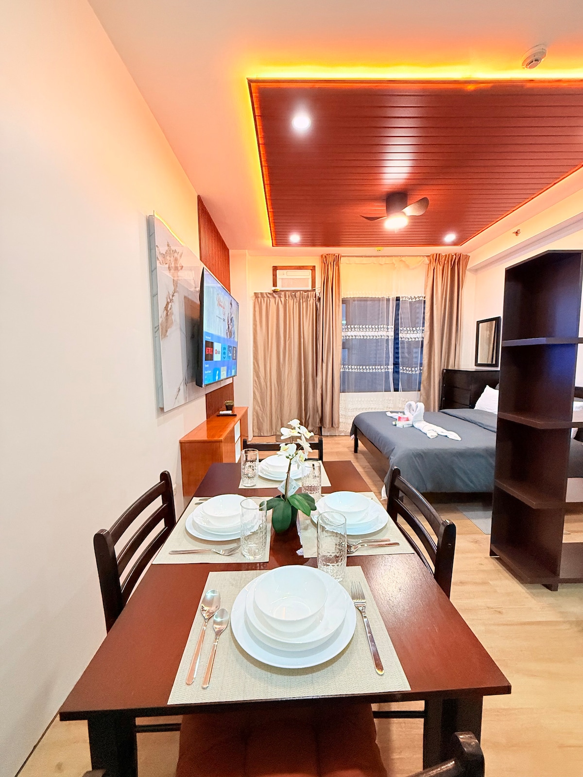 The Studio Apartment is 36sqm. on the 27th floor of 8 Adriatico Condominium in Malate, Manila. A room with huge windows and an amazing Manila Bay View. A fully furnished 36 sqm unit with a Queen sized bed, Bathroom, Kitchenette, Dining set, TV(basic local channels only), Strong Wi-Fi, Air Con and with our single size sofabed, we can comfortably allow 3 guests.
