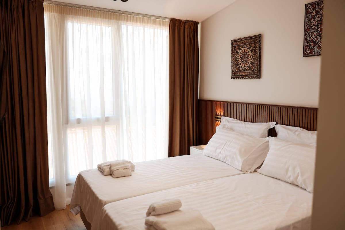 Tere tulemast meie luksuslikku katusekorterisse Kruja lossi ja vana basaari lähedal! 5. korrusel (ilma liftita) mahutab 8 külalist, kellel on 3 magamistuba, 2 diivanvoodit, köök, wifi, kliimaseade elutoas ja peamine magamistuba. Ülejäänud kaks magamistuba on avatud akende ja sääsekaitsega jahedad - sageli paremad kui kliimaseade! Naudi suurepäraseid vaateid, mõne sammu kaugusel kauplustest, kohvikutest ja tasuta avalikku parkimist. Sisaldab lauamänge, nagu kaardid ja jenga - ideaalne peredele või rühmadele. Sinu ideaalne baas lõõgastumiseks või Kruja südame avastamiseks!