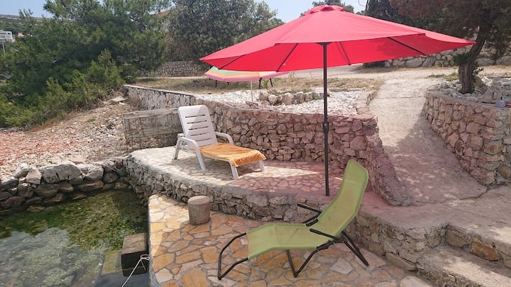 Perched on steep rocks, 30m above the sea level, this idyllic studio is a perfect getaway for a much needed vacation. Surrounded by a vegetation reserve of Dubrava-Hanzine, it offers a luxurious experience - the sweeping views of the Pag Bay and the mountain range of Velebit, for one. Beach Rozin Bok 50m from the apartment. Parking, A/C, outside grill, and outside solar shower included. SUP and kayak are available during the stay in the apartment.