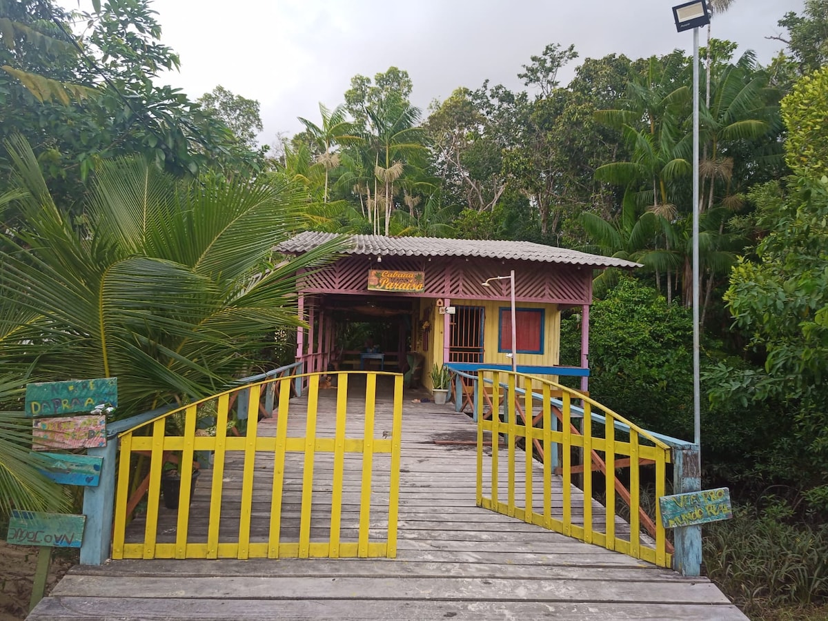 Relaxe neste espaço calmo e cheio de estilo nesta linda cabana na Praia Belo Paraiso, tenha contato direto com a natureza, cercada de igarapés que você pode desfrutar de belos passeios de canoas como também pescar. Canoa e varas de pescas disponíveis na Cabana.