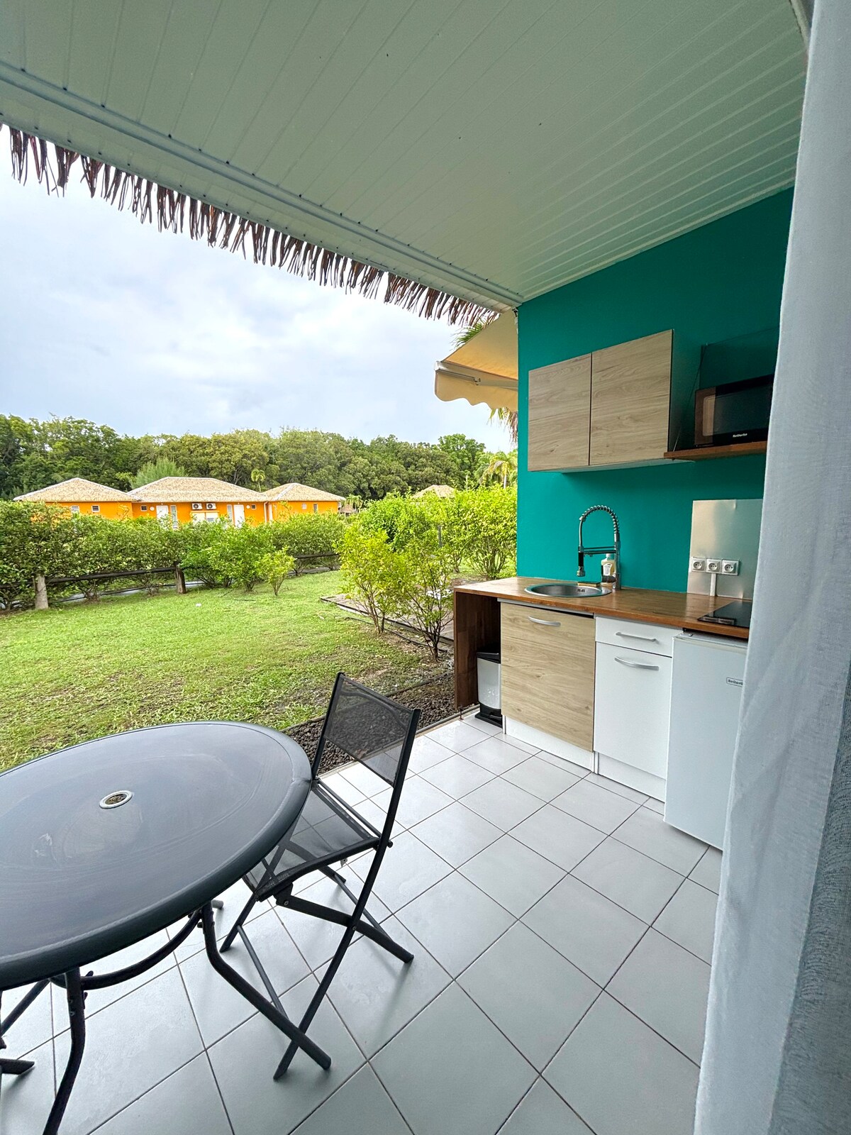 🌴 Bienvenue à La Marigalantine Situé dans le village Kawann, calme et sécurisé, le bungalow La Marigalantine bénéficie d'une proximité à la plage accessible à pied en poussant le portail du site. Moderne et décoré avec goût, il est idéal pour des vacances en couple et offre le confort et les équipements indispensables pour un séjour réussi ! Il dispose d’une terrasse bien exposée avec vue sur jardin tropical et permet de rejoindre le complexe en moins d'une minute.