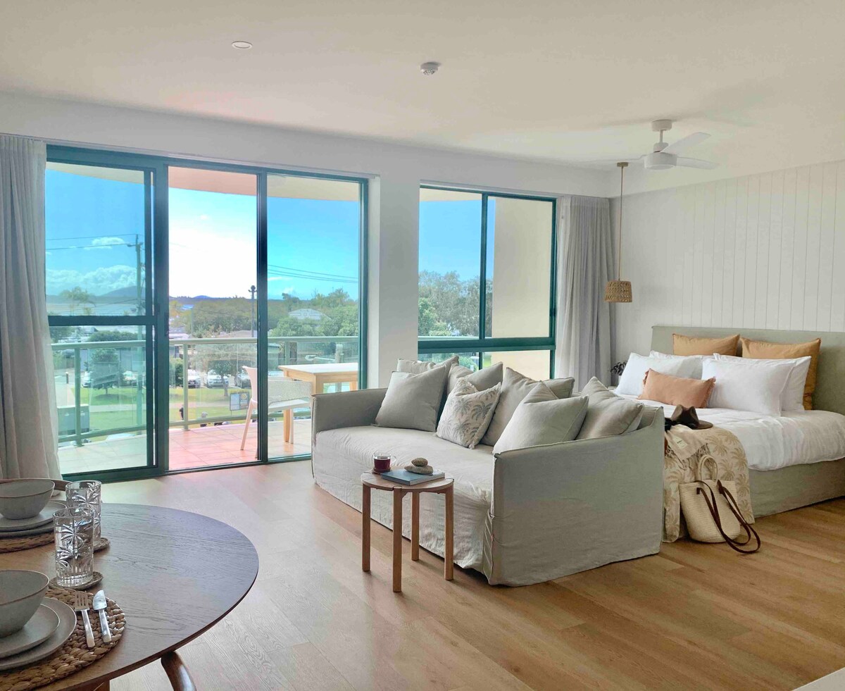 Our private Guest House is just a short stroll from beautiful Mudjimba beach offering you a relaxing romantic getaway or a creative space to work. One bedroom with Queen bed, desk, crisp linen, comfortable lounge, TV, dining area and window seat. A full kitchen includes a coffee maker, although we highly recommend the local cafes and restaurants which are an easy walk away. I would love to host you in our Guest House - you can send me a message with any questions that you may have.