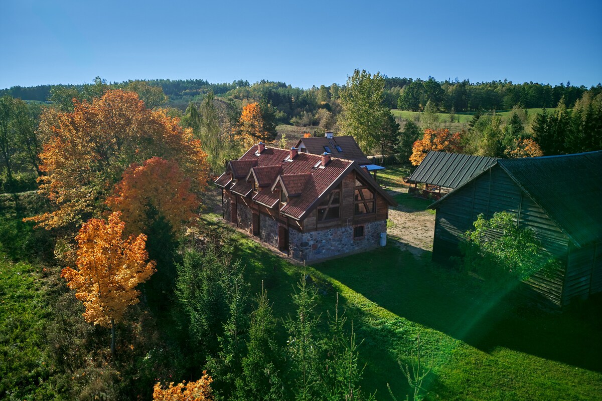 See võluv kodu, mis on täis nostalgilisi detaile, on peidetud Masuria roheliste mägede vahele. Verandalt avaneb otsene vaade järvele. Muinasjutuline koht, kus kuuled ainult looduse helisid: konnad, kriketid, käk. Endine talu on renoveeritud hulga armastusega ja puiduga ilusaks koduks rahu ja looduse armastajatele. Külaliste käsutuses on kogu (tarastatud) krunt, koerad on teretulnud. (Talu on jagatud kaheks majaks, mida on võimalik broneerida koos ühe majutuskohana.)