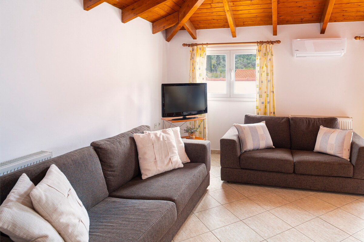 Traditsiooniline suvila, hiljuti renoveeritud, arvestades kohalikku traditsiooni. See ülakorruse korter, kuhu pääseb trepist, mahutab kuni viis inimest. Selles on kaks magamistuba, ühekohaline kaheinimesevoodi ja kahekohaline kaheinimesevoodi. Seal on elementaarne kreeka stiilis köök, kus on ahi, külmkapp, kohvimasin ja kõik vajalikud riistad. Duširuumis on dušikabiin, WC ja valamu ning pesumasin.