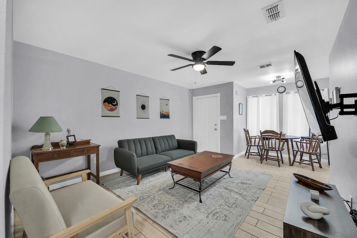 Welcome to The Luxe Townhome, Home Features: ★Luxe furnishings & design ★Centrally-Located ★65-in Ultra High Definition Smart TV ★Peaceful Neighborhood ★Free Garage Parking ★Easy Self Check-In | Free Fast Wifi! ★Smoke-free Local Go To’s: ★Convention Center Shopping Mall & Restaurants ★Grocery: HEB, Walmart, Target, Dollar General ★Restaurants: Prime Steak, PF Chang’s, etc ★Mission Regional Center / STHS Hospitals / DHR ★La Plaza Mall ★McAllen International Airport