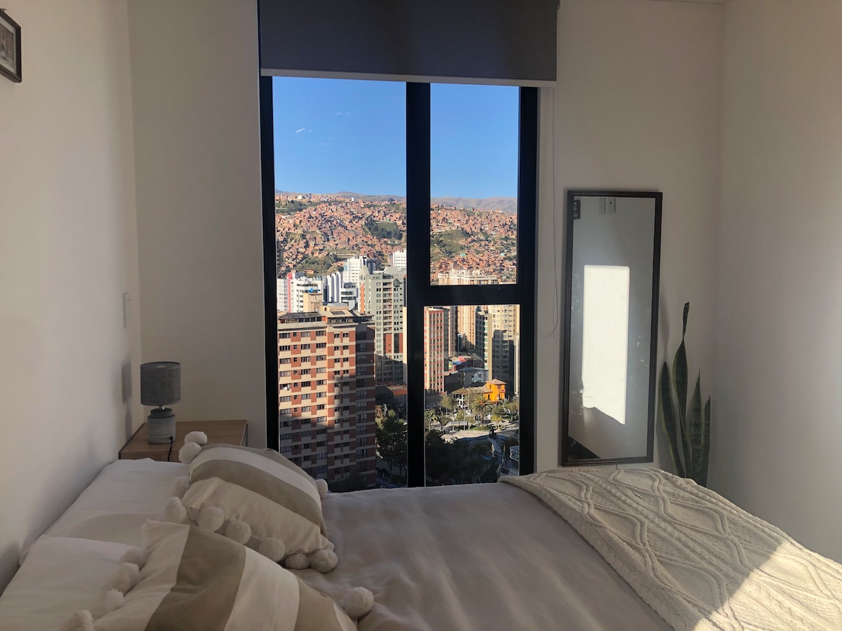 Uus korter, avar, kõrge korrus ja väga valgusküllane. Suurepärane puhkamiseks või tööreisideks. Sellel on üks magamistuba jalutuskapiga, kaks täielikku vannituba, varustatud köök ja suur ilusate vaadetega elutuba. Asub turvalises piirkonnas, kohvikute, restoranide ja supermarketite lähedal, suurepärase ühendusega ühistranspordiga. Kui eelistad kõndida, on see ideaalne, et hõlpsasti ringi liikuda. Naudi La Pazi mugavuse, stiili ja soojusega. Sinu hubane majutuskoht ootab sind!