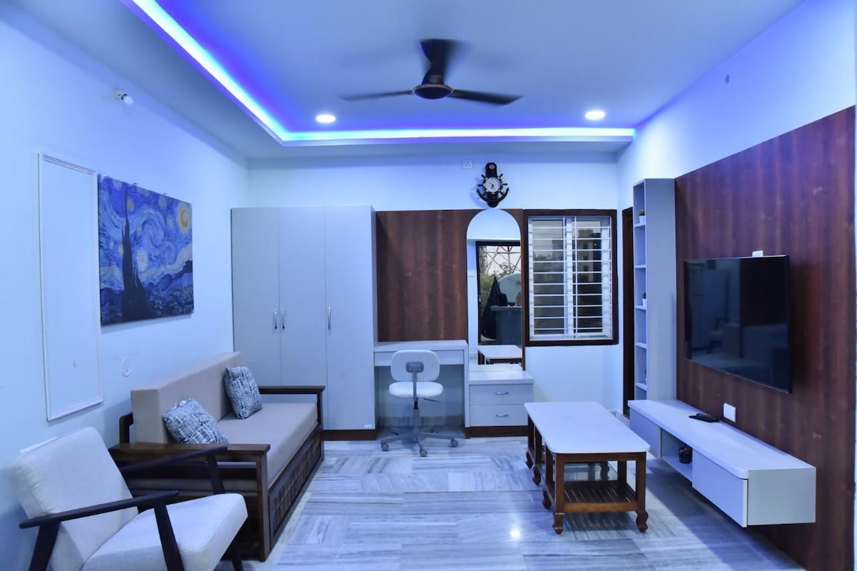 Home stay, designed for comfort, peace, and convenience. A fully furnished floor of an independent house. 20–30 mins to RGIA Airport 10 mins to LB Nagar Metro Secunderabad Station (~40 mins) Bedroom: • King-size bed with mattress and linens • Wardrobe, mirror, Curtains and ceiling fan Kitchen • Gas stove, utensils, fridge • RO water purifier Living/Dining Area: • Sofa, dining table for 6 • Smart TV with Wi-Fi, geyser, cleaning service • 24/7 water • Nearby grocery, medical stores, cafes