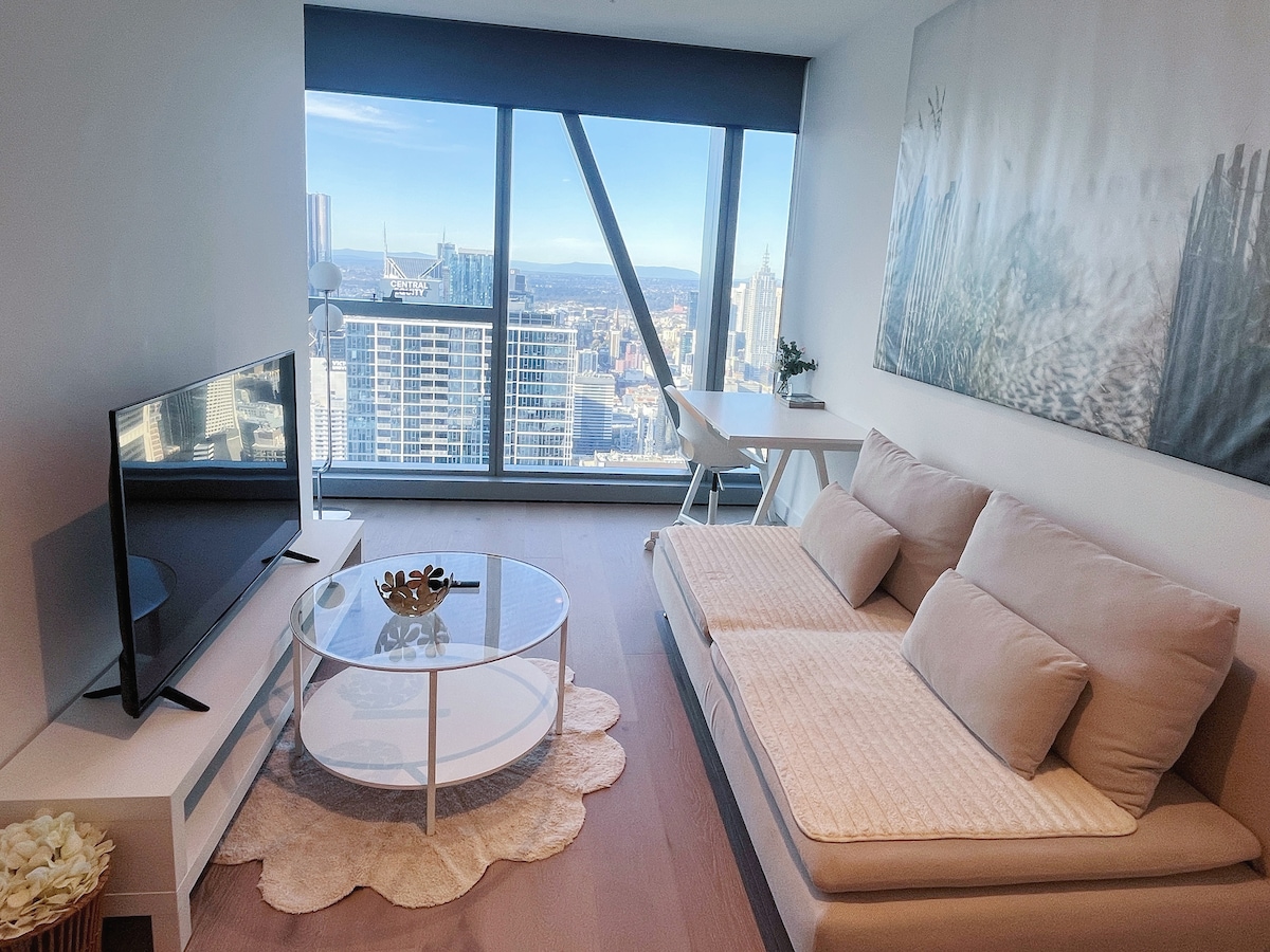 Suur 1B1B korteris 45F, mis asub südames CBD-s, luksus, mis on kaunistatud Winter Gardeniga, hämmastav riverview linnas, eriti suurepärased öised vaated, kuna see asub kõrgel korrusel. kena ja hubane majutuskoht Melbourne 'i keskjaama lähedal, Victoria turu, supermarketite, trammide, restoranide, kohvikute jne lähedal. Lai valik kõrgklassi restorane ja hotelle. Ostubrantši ja meelelahutus on kõik kaetud. Tasuta kiire wifi. Netflix TV. Kasuta täielikult ära mugavusi, nagu jõusaal, basseinid.