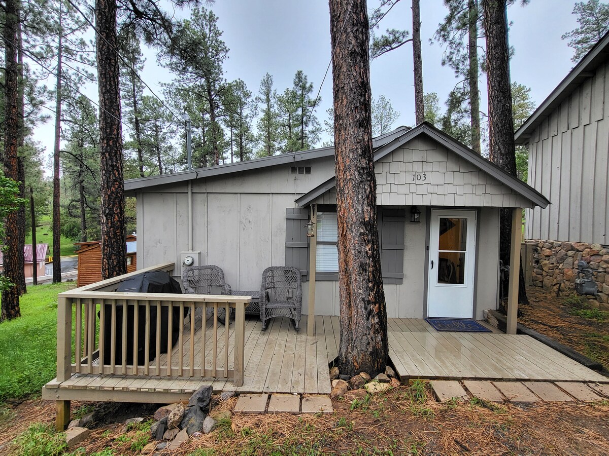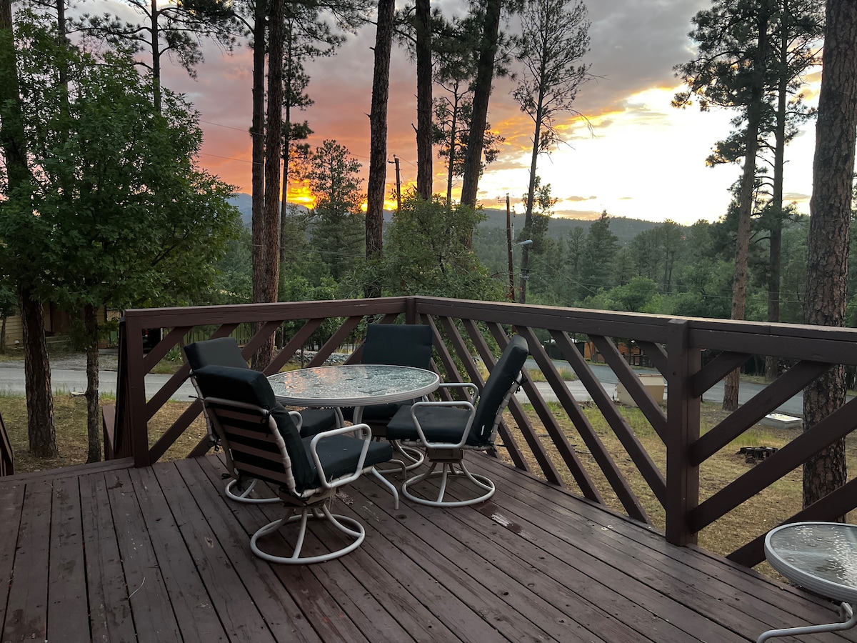 This cozy cabin is perched calmly among the tall pines and is perfect to accommodate up to 4 guests. Featuring one bedroom, one bathroom, living room, dining area, full kitchen, desk, new hot tub, and deck; it is ideal for those that want to unwind and enjoy what Ruidoso has to offer. It is situated in a quiet neighborhood that is a brief 10-minute stroll down the hill to Midtown, the village center for shopping and restaurants. The cabin is 37 min drive to Ski Apache, 10 min drive to casinos.