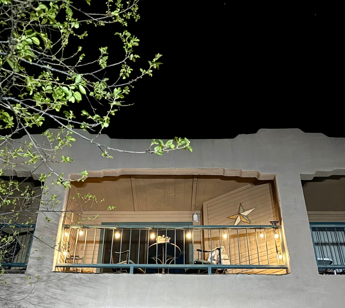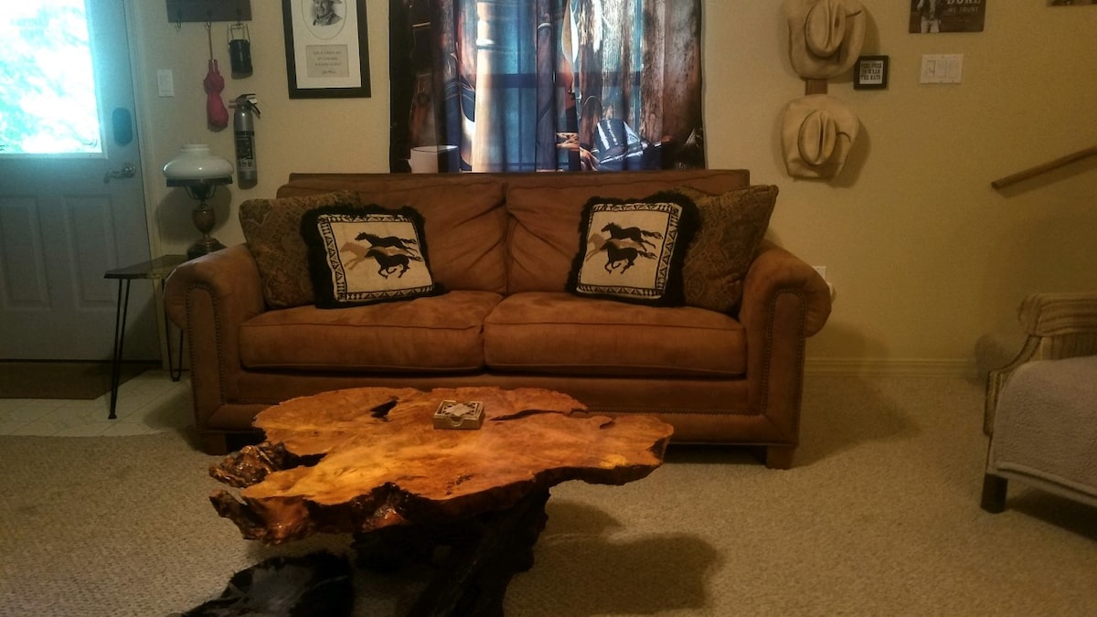 'The Duke' is a John Wayne inspired western themed space perfect for a quiet getaway to Ruidoso and located on the main road into town. This is the downstairs to our primary home that we have converted to 'The Duke' with John Wayne western décor, comfortable living room with mini fridge, microwave and coffee. Don't forget to peek into the kid friendly 'cupboard under the stairs' Harry Potter inspired closet. Relax each day on the 6' by 40' covered deck listening to the Rio Ruidoso river below