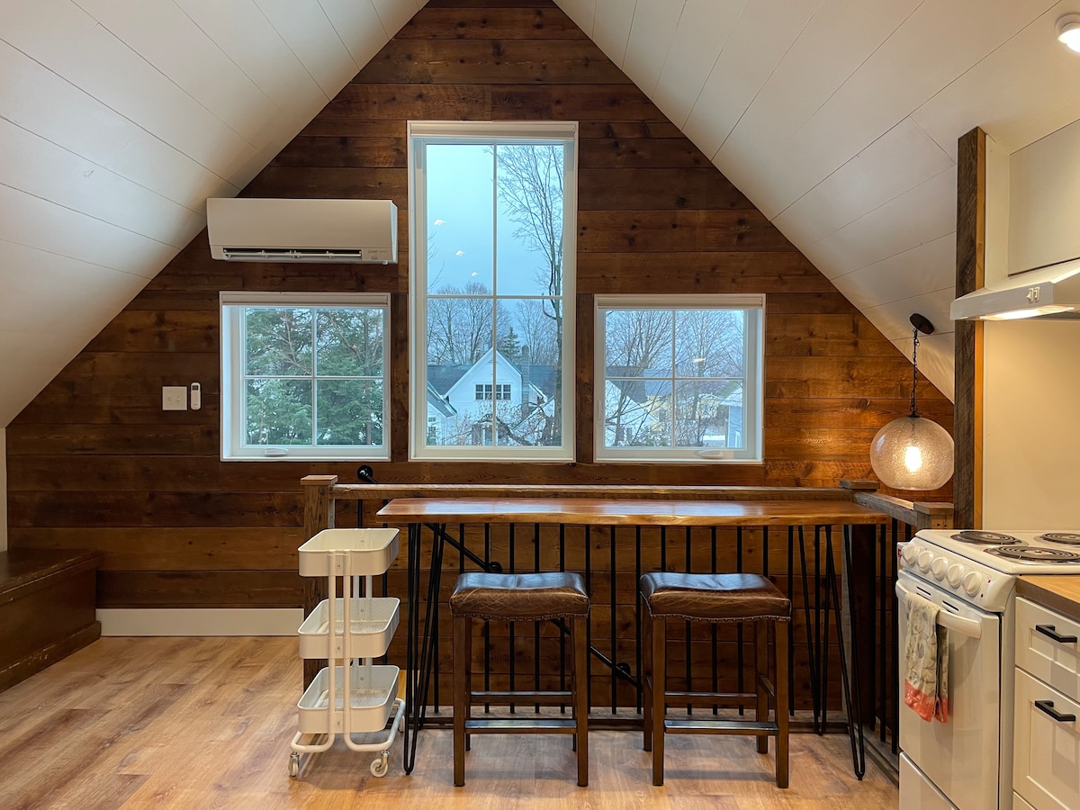 This studio apartment attached to the main house has a style all its own. Contemporary design with high ceilings, clerestory windows and a skylight. Spaces include a large Living Room/Bedroom, Kitchen/Dining area, bathroom with a step-in shower and an adjoining Dressing Room with vanity and sink. There is also an outdoor covered space to enjoy. Furniture includes a Queen size bed, 3 comfy chairs, small round table and 4 chairs. Location is a bit more than one mile from downtown Middlebury.