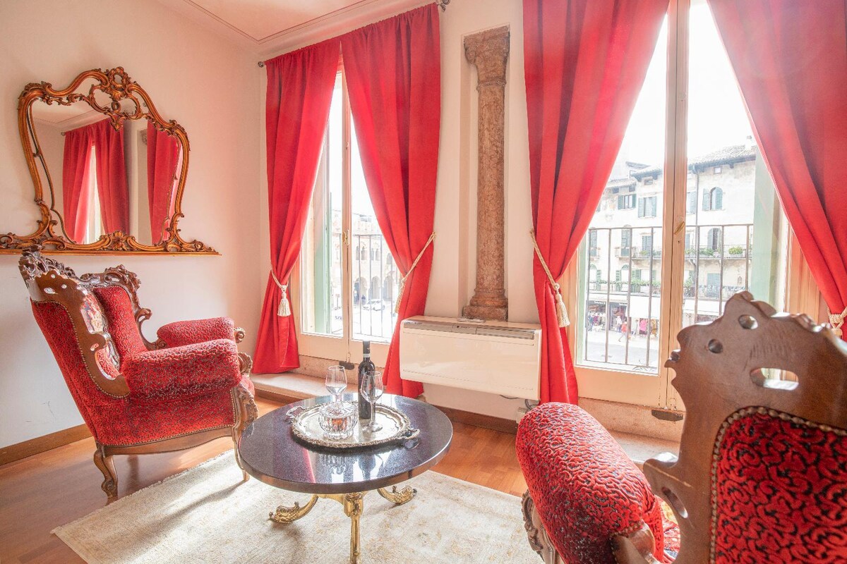 2 magamistuba 2 vannituba hämmastav korter suure terrassiga otse üle ja nbsp;Piazza delle Erbe ja rõdu, kust avaneb vaade Piazza dei Signorile (Piazza Dante). See on Verona parim asukoht, korter asub teisel korrusel 15. sajandi palazzo affrescoed Casa Mazzanti (UNESCO poolt kaitstud).