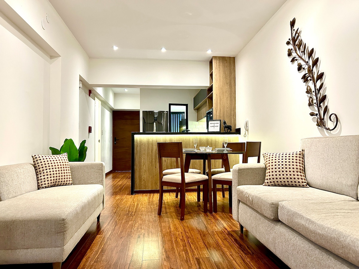 Monoambiente cómodo y seguro cerca al Óvalo Papal. Equipado con una cama de dos plazas y dos camas individuales, ideal para hasta cuatro personas. Cuenta con TV de 55 pulgadas con acceso a plataformas de streaming y WiFi de alta velocidad. Ubicado dentro de un condominio privado con vigilancia permanente y videovigilancia. Excelente ubicación con acceso rápido a transporte, comercios y puntos de interés.
