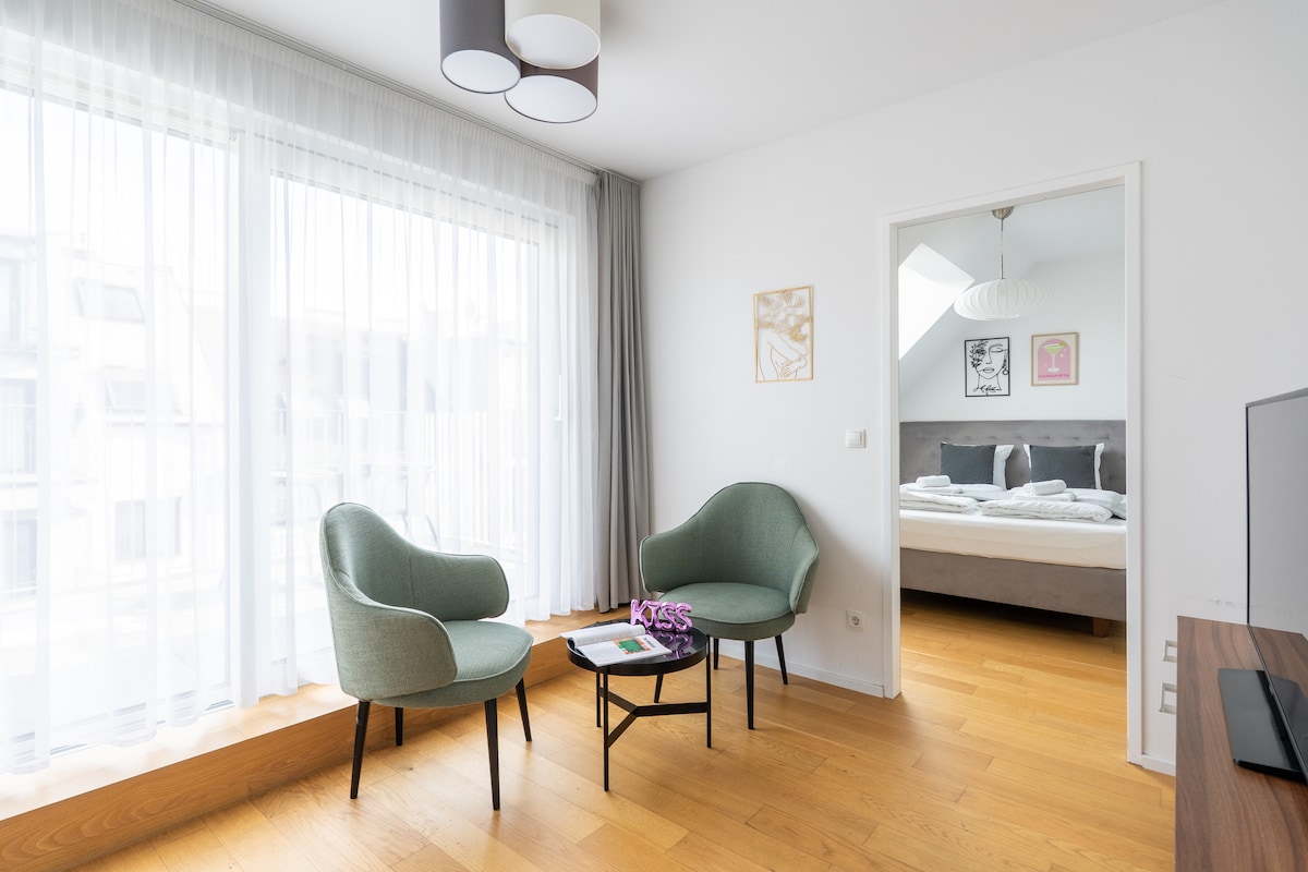 Welcome to our Sleek 1BR Suite, located directly in front of the U1 metro station Altes Landgut. Stephansplatz and Vienna’s city center are just 10 minutes away by metro. Key Highlights: • Professionally managed property • Paid garage parking available on the premises • On-site amenities: luggage lockers, laundry room & lobby