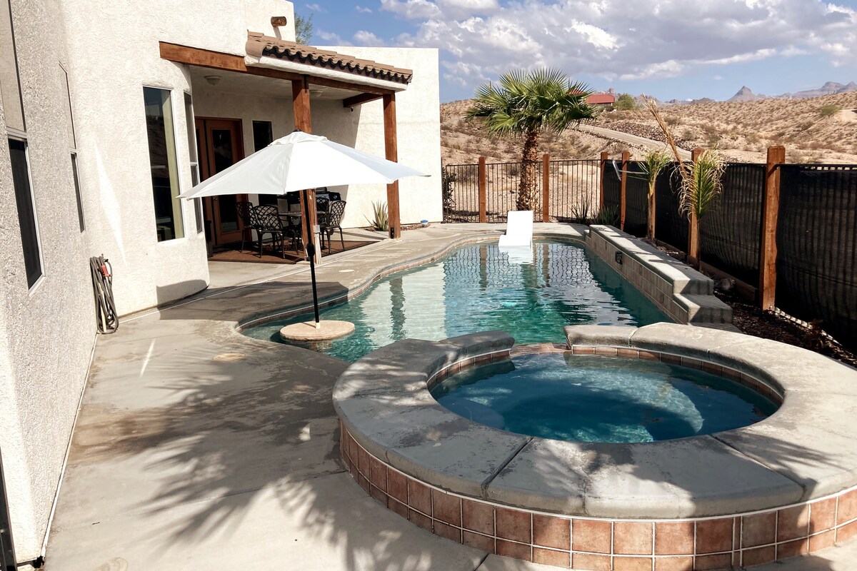 Relax and enjoy the desert landscape. Secluded, private, and spacious 2400sqft entire home with heated pool and hot tub (see house rules). Completely custom home, beautifully decorated with designer furniture throughout. 10min away from the Laughlin Bridge and Katherine's landing but a world apart. Quiet, peaceful, private, with unbelievable views of the stars, city lights, mountain landscapes. One-of-a-kind desert getaway. Lots of easy and safe boat or toy hauler parking, ez access to trails.