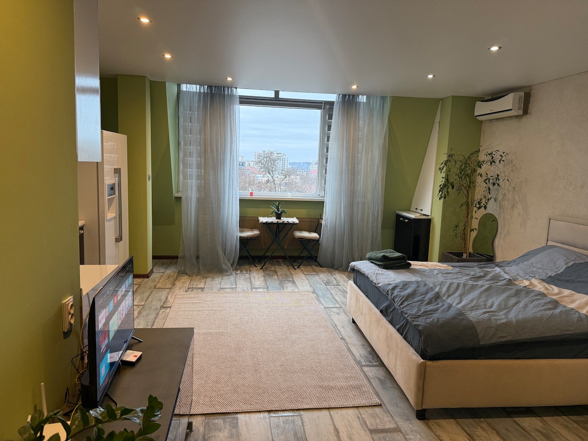 Ideaalne majutus neile, kes otsivad midagi erilist ja suurepärast asukohta linna avastamiseks. See hämmastav stuudiokorter asub Chisinau ajaloolises keskuses, restoranidest, kaubanduskeskustest ja peamistest turismiatraktsioonidest jalutuskäigu kaugusel. Korter on hästi kujundatud, luues mugava ja stiilse keskkonna sinu peatumise jaoks. 15. korrusel asuvad suured aknad, kust avaneb panoraamne linnavaade, ilma et see segaks hooneid.