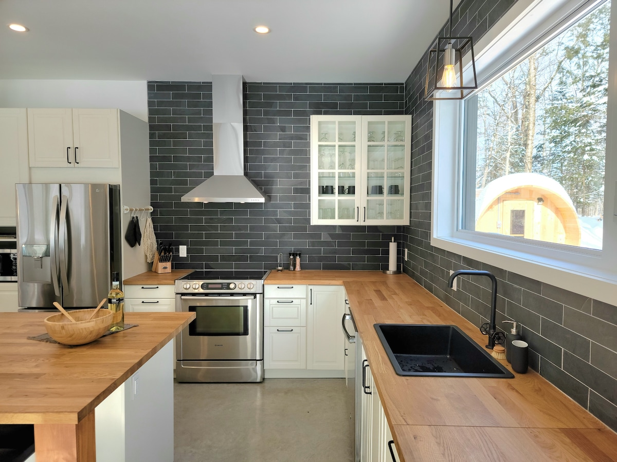 Situé au pied du Mont Sutton, ce havre de paix en forêt est constitué de deux chalets superposés, offrant ainsi une expérience unique. La construction neuve de 2019 séduit par sa luminosité et son aménagement à aire ouverte. Chaque chalet est entièrement équipé et décoré avec goût, vous assurant un séjour des plus confortables. De plus, nous avons veillé à une insonorisation adéquate pour garantir votre tranquillité. À seulement une minute des pistes de ski du Mont Sutton et 5 minutes du village