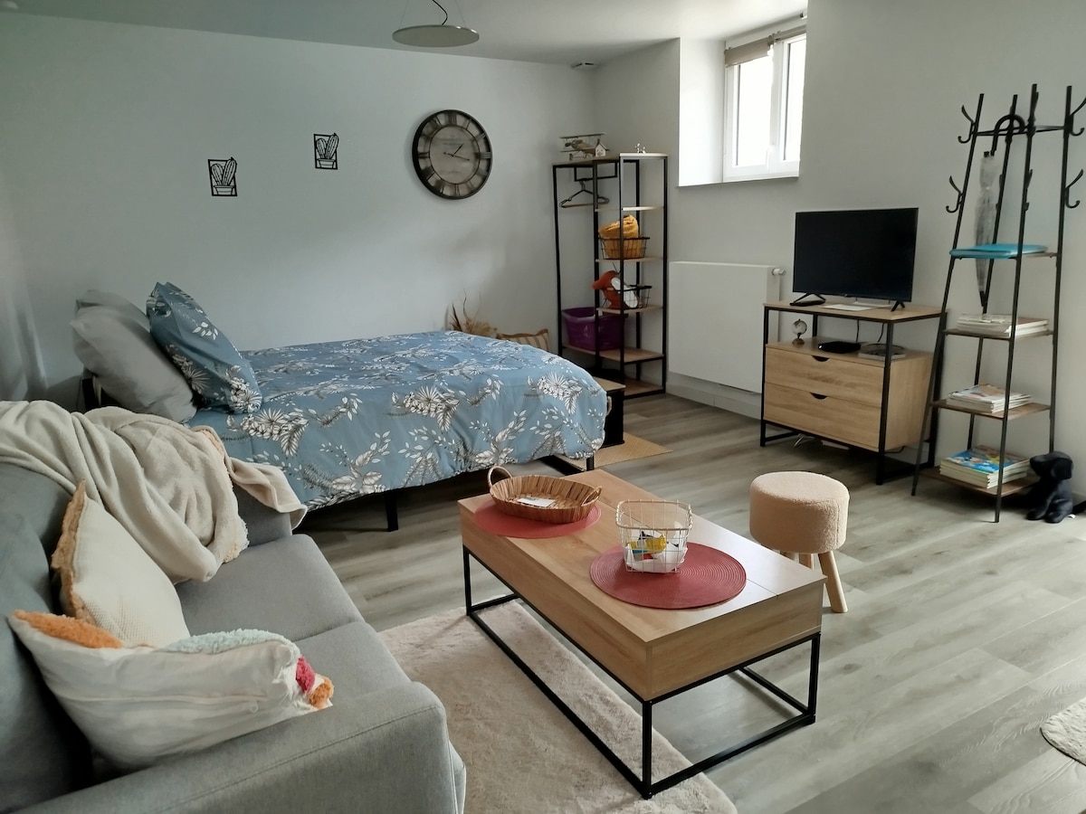 Suurepärane 40 m2 suurune stuudio, renoveeritud esimesel korrusel, iseseisev sissepääs, vaikne, ideaalne 3 inimesele, asub looduse südames Marne 'i, viinamarjaistanduste ja metsa vahel. Poed 5 minuti autosõidu kaugusel, Ile de France SNCF raudteejaam 10 minuti autosõidu kaugusel. 1 kaheinimesevoodi, 1 võrevoodi ja kuni 12-aastased mängud, batuud, mänguväljak lähedal. See sobib ideaalselt lastega peredele. Köögiruum, mugav diivan, suur teler, pesumasin. Tervituspakkumine: pudel veini.