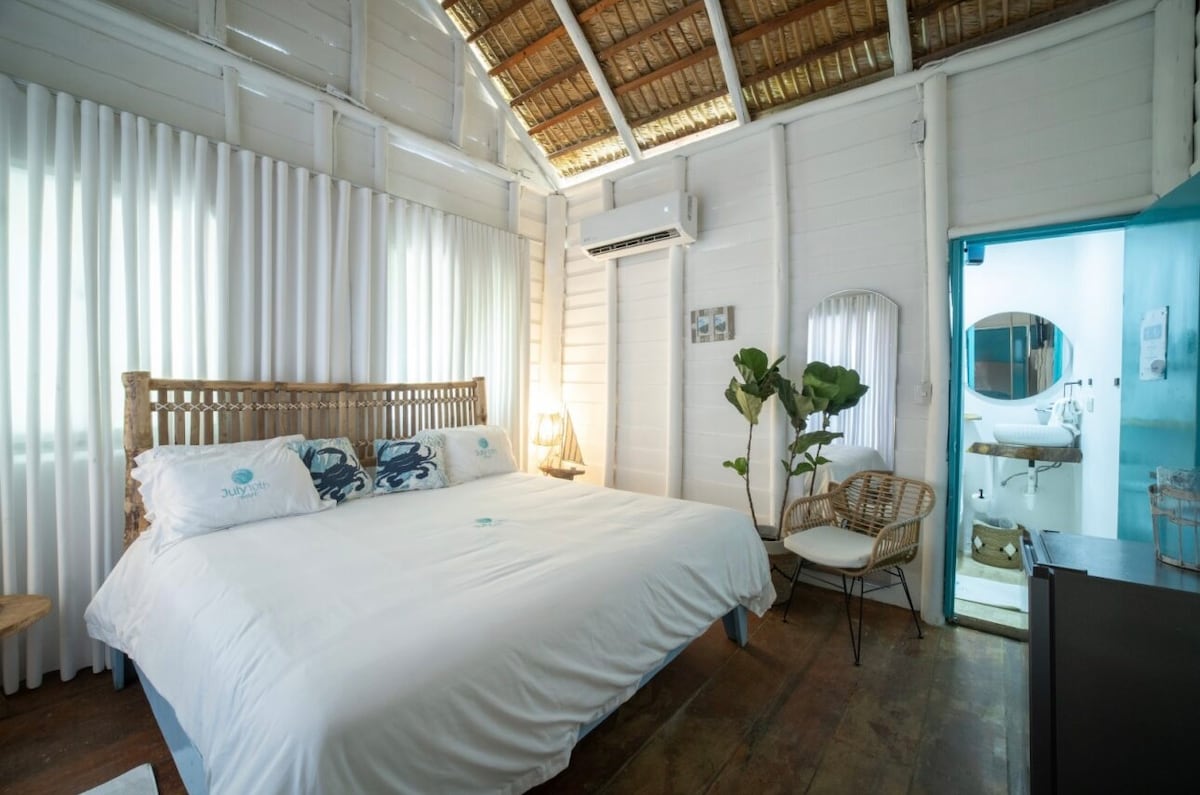 This room is on the second floor of our beach club Blue Island Punta Rucia, please follow us on social media. The restaurant/ bar opens during the day from 9 am to 8 pm. The cost of the room includes breakfast starting at 9:00am. The room has it’s own full private bathroom and a balcony area facing the beach. The common area includes a couple of sofas and a small dining table in an open terrace facing the beach. We provide unlimited drinking water from a cooler on the second floor.