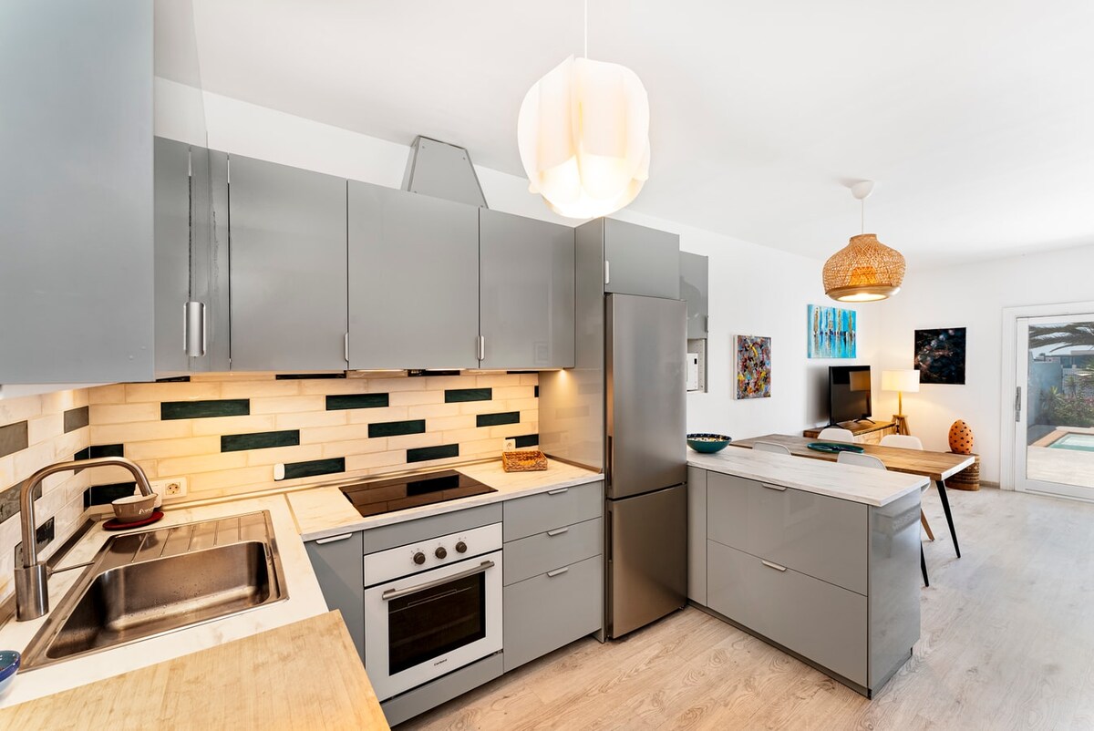Kena iseseisev villa Playa Blancas. Montaña Roja vulkaani jalamil, vaikselt ja suunaga lõuna poole. Troopiline aed mustal vulkaanilisel scorial ja bassein, mida soojendatakse temperatuurini 28 °C. Välidušš. 2 kaetud terrassi aiamööbli, terrassitoolide, Bali voodi ja kaetud välisöögitoaga. Privaatne parkimine. Sissepääs, suur elutuba, hästi varustatud köök, 1 magamistuba marmorist vannitoa ja garderoobiga, 1 kaheinimesetuba riietuse ja marmorist vannitoaga 50 Mbit/s WiFi, 55. nutiteler.