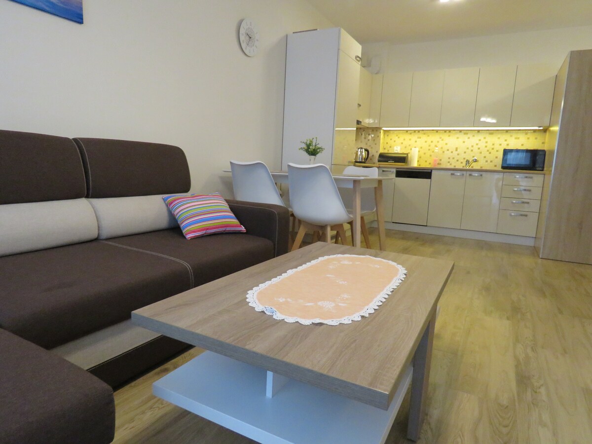 Korter asub teisel korrusel, kuhu pääseb liftiga. Korteril on kööginurgaga elutuba, mugava voodiga magamistuba ja dušiga vannituba. Nii elutuba kui ka magamistuba viivad kahe väljapääsuni avarale terrassile (12 m2), mis on varustatud puhketoa mööbliga. Tasuta WiFi. Köök on varustatud kõigi vajalike köögiseadmetega. Juurdepääs satelliidikanalitele. Voodipesu ja rätikud on olemas. Meil on külalistele saadaval kaks jalgratast.