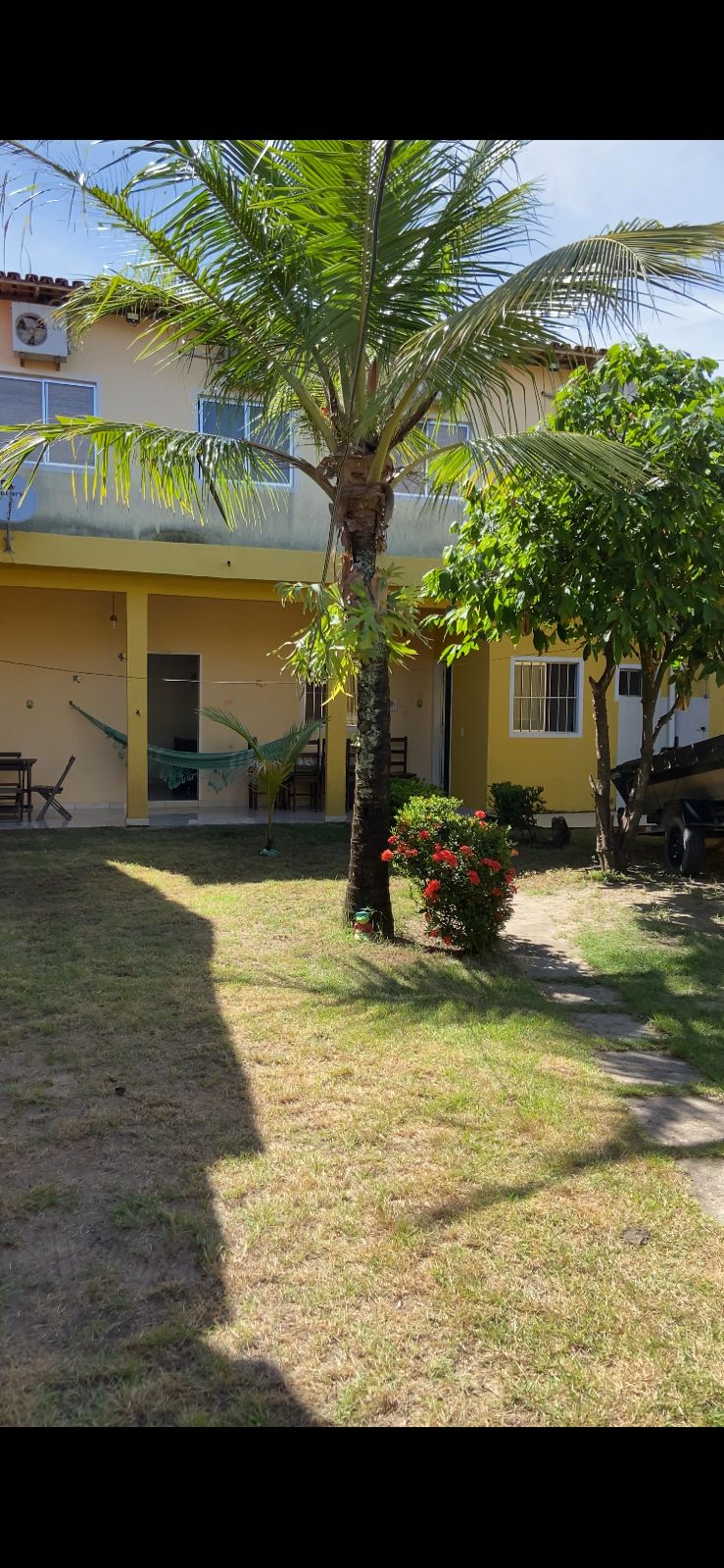 Casa com 2 quartos, sendo 1 suíte, 2 banheiros, apenas 1 chuveiro elétrico, chuveiro no quintal, cozinha equipada e ventilada, vagas para 4 carros, 2 camas casal e um colchão casal extra, 3 ventiladores, não temos ar condicionado, menos de 2 minutos caminhando para praia.