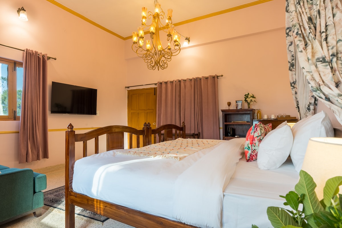 Seclude Nahan, Bantony Cottage : 2 Bedroom Royal Suite (Maharaja + Maharani Suite) Experience royal living in the hills with our 2-Bedroom Royal Suite at Seclude Nahan. This exclusive wing combines the elegant Maharaja and Maharani Suites, complete with a private living room, personal dining area, and stunning views of the Sirmour valley. Designed for families or two couples traveling together, the suite offers vintage charm, spacious comfort, and the warm hospitality of a private estate.