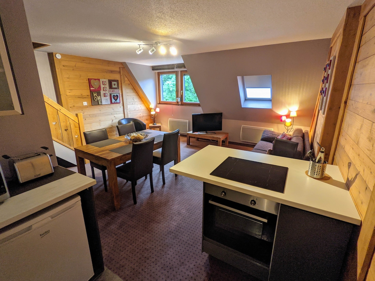 30 minuti kaugusel Lac Blanci kuurordist, 15 minuti kaugusel Schluchtist, 35 minuti kaugusel La Bresse'ist, asub meie majake meie maja esimesel korrusel küla keskel, eraldi sissepääs, köök on varustatud mikrolaineahju, rösteri, kohvimasina, veekeetjaga. Suur avar magamistuba ootab sind oma kaheinimesevoodiga 160 x 200. Avar vannituba dušiga, lõõgastav elutuba ilma telerita koos küttega.