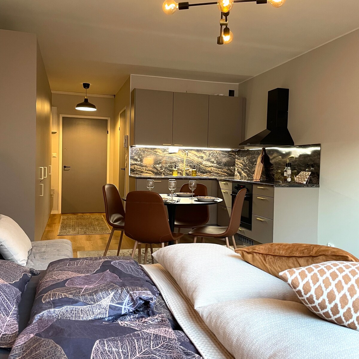 Meie vapustav 27,5 m2 stuudio asub otse Tampere kesklinna südames, Tammelantori turu kõrval. Korter asub äsja valminud eluaseme ühingus ja ostlemisreis, et lihtsustada väljapääsu vastas asuva esmatarbekaupade poe leidmist. Korter on hästi varustatud, seal on toiduvalmistamisvahendid, kvaliteetsed puhtad rätikud ja voodipesu, kvaliteetne kohv ja tee ning film õhtuti 50-tollise qled-teleriga. Ööpäevaringne sisseregistreerimine Professionaalne koristamine Parim asukoht Kiire klienditeenindus