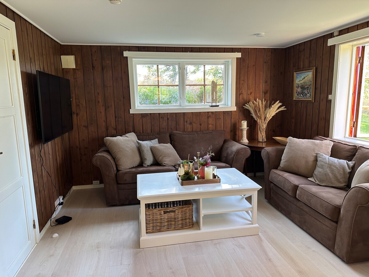 Lett tilgjengelig overnatting for korte eller lengre perioder. Leiligheten ligger i egen bygning med inngang fra bakkeplan og rommer vindfang/gang, stue med kjøkken, bad og sovehems. Kjøkken har stekeovn, kokeplate, micro, kjøleskap, kaffemaskin og oppvaskmaskin. Utstyrt med servise, bestikk og utstyr til enkel matlaging. Badet har WC, servant og dusjkabinett og vaskemaskin. Soveplass på hems (120 cm), dobbel sovesofa (140 cm) og sovestol (75 cm). WiFi 55" TV med Chromecast.