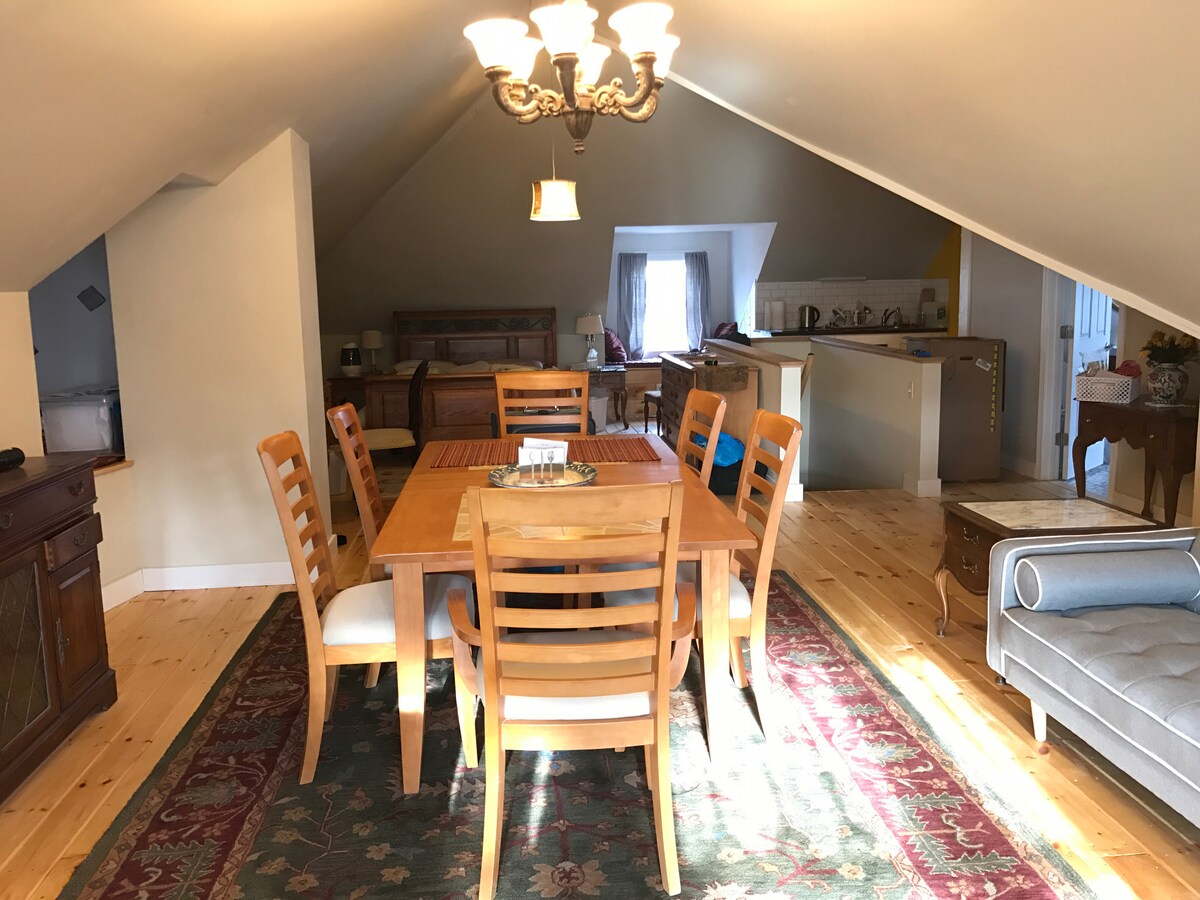 Lõõgastu selles stiilses stuudios! Meie maja asub vaikses vanemate majutuskohtade naabruskonnas, mida ümbritsevad metsad, kuid mis asub mugavalt kesklinnas, poole miili kaugusel meie rohelisest külast (Milford Oval). Lühike jalutuskäik üle jõe viib sind kohvikutesse, restoranidesse, pubidesse, kus on elav muusika, postkontor, raamatukogu, poed ja kasulikud poed, nagu CVS. Ükskõik, mis sind toob...äri, suusatamine, matkamine, antiikesemed, perepidu või romantiline nädalavahetus...ootame väga sinu majutamist!