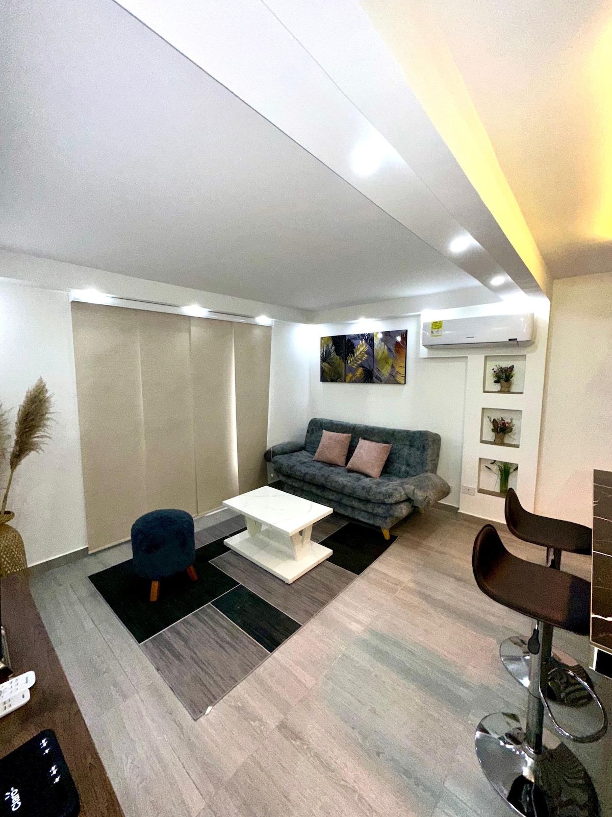 Acogedor y cómodo apartamento tipo loft con aire de 24.000 btu, escaleras y puerta de acceso con cerradura digital independiente. Cuenta con cocina equipada, barra americana con sillas, baño completo, escritorio de trabajo, sofacama con sala y sonido de techo, cama doble y Tv de 40" con streaming. Terraza al aire libre con jacuzzi electrico y wifi de fibra optica 900 mbps. Muy bien ubicado cerca a la alcaldia, camara de comercio, restaurantes y bares.