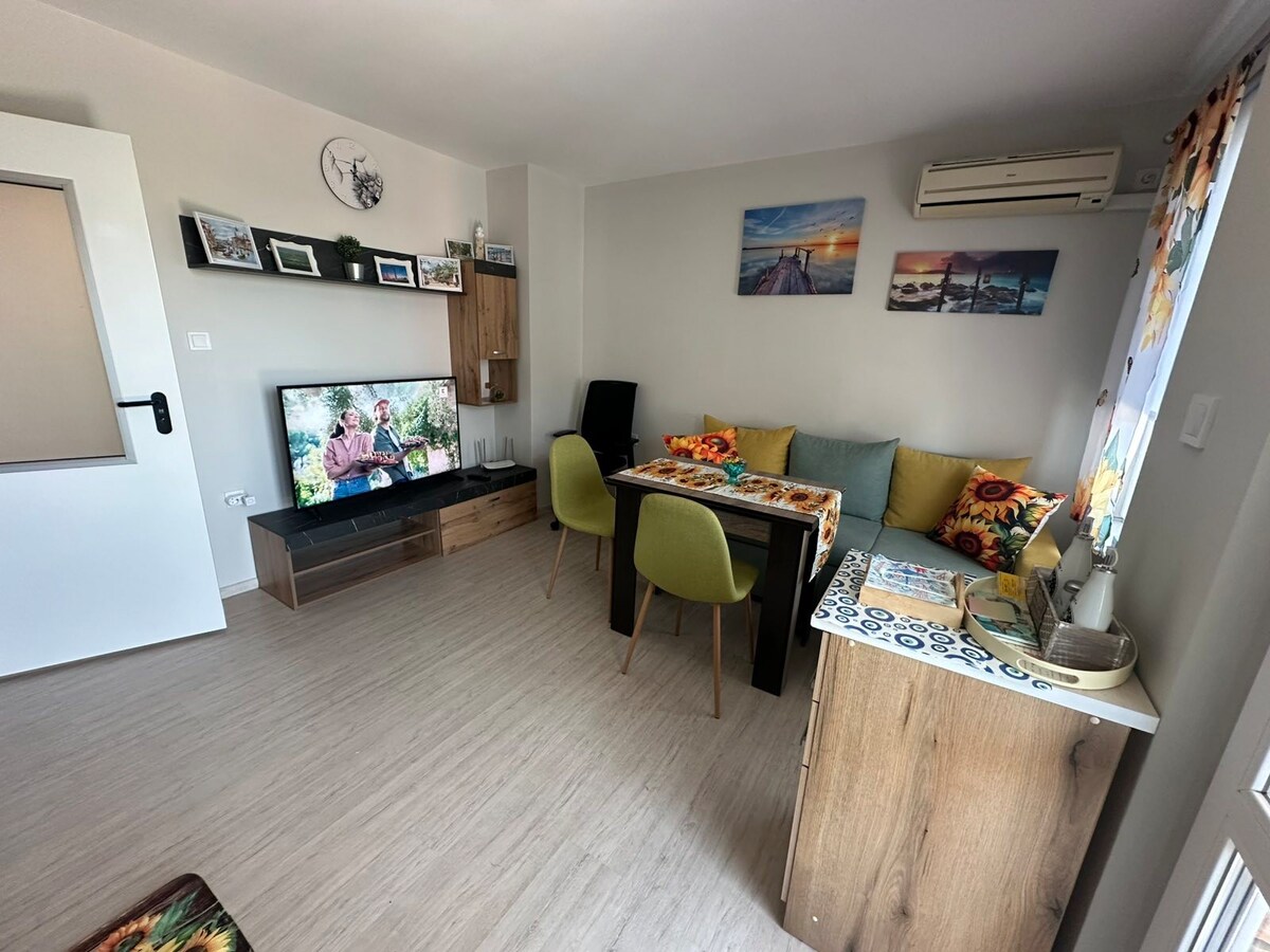 Luksuslik üürikorter Pomorie's Stiilne ja täielikult sisustatud korter, mis asub linna keskosas, vaid 5-minutilise jalutuskäigu kaugusel restoranidest, kohvikutest ja kesklinnast. Naudi mugavust kõigi mugavustega: kliimaseade, kiire wifi, nutiteler, täielikult varustatud köök, pesumasin ja kolm rõdu lõõgastumiseks. Ideaalne peredele, paaridele või sõpradele, kes soovivad nautida päikest, randa ja lõõgastuda täiesti mugavalt.