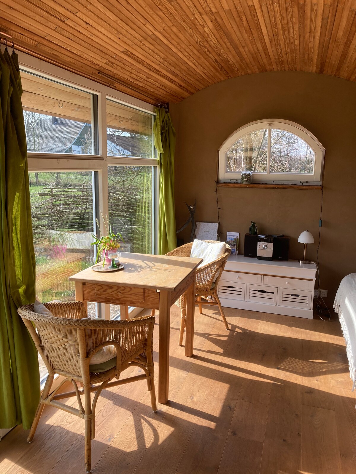 Komm an diesem unvergleichlichen Rückzugsort wieder in Einklang mit der Natur. Egal ob Sommer oder Winter. Der Bauwagen steht auf unserem Hof in Alleinlage umgeben von Feldern und Wiesen. Herliche Gegend um Spaziergänge in der Umgebung zu machen. Hier kannst du deine Seele baumeln lassen, am Lagerfeuer sitzen und Sterne gucken, oder am Ofen sitzen und den Panoramablick genießen. Einfach mal vom Altag abschalten oder auch nur den Ausblick in die wunderbare Natur geniessen.