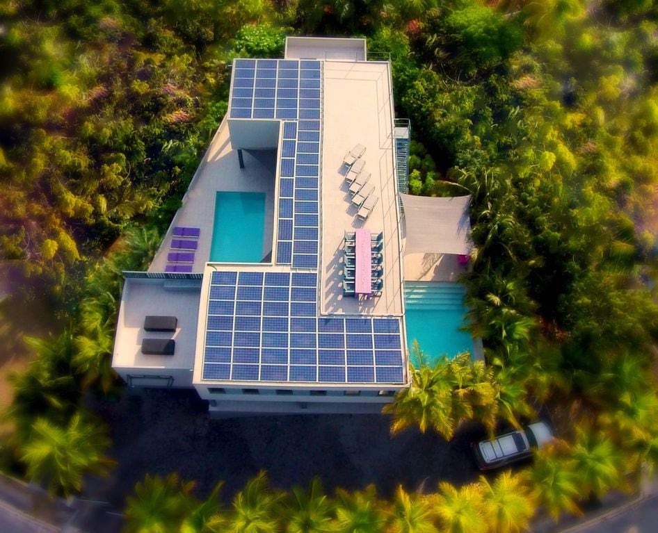 The most spectacular giant stylish villa of the Caribbean on this colorful island. Dazzling spacious. Sophisticated interior design featured in lifestyle magazines. Views to die for. Quality gallery modern Art-work. Located on top of the hillside of chic secure gated Jan Sofat at the Spanish Water Bay. Daily cleaning, towel service and electricity included. All your guests together in one jet-set villa. For your yoga retreat, anniversary get-together, fashion shoot or luxury stay with framily.