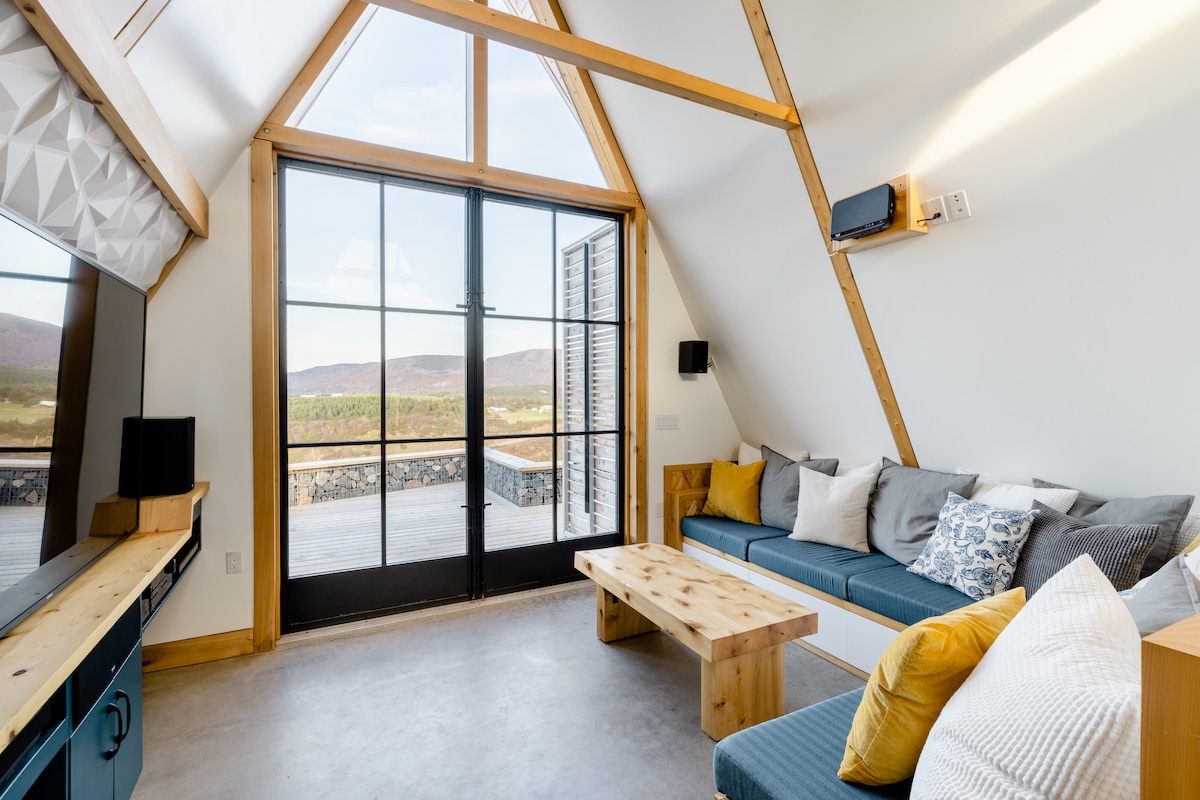 Perched high above Grand Étang, Cedar Peak offers sweeping views from highlands to ocean. Watch sunrise pour through the 13-ft window as you enjoy coffee in the open-concept living space. After a day of exploring Cape Breton, unwind on the panoramic patio at sunset. Purpose-built as a secluded, barrier-free chalet, Cedar Peak features a full kitchen, home theatre, and thoughtful comforts for an unforgettable stay.