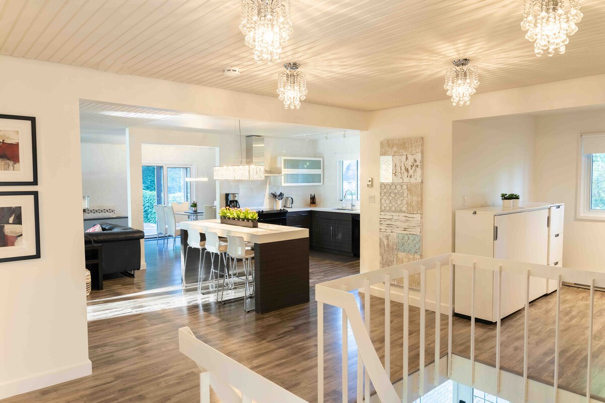 Come escape to our beautiful home and explore Niagara Falls. Enjoy both indoor and outdoor living in our home. Our home offers open-concept living/family/den and dining room space with modern touches. Office desk and chair for remote work. Snuggle by the fireplace or enjoy the outdoor hot tub. 4 clean and comfortable bedrooms, and 2 full bathrooms. Smart TVs, a fully equipped chef kitchen, and free Wifi to make your stay even better. Enjoy the outdoor space and bbq.