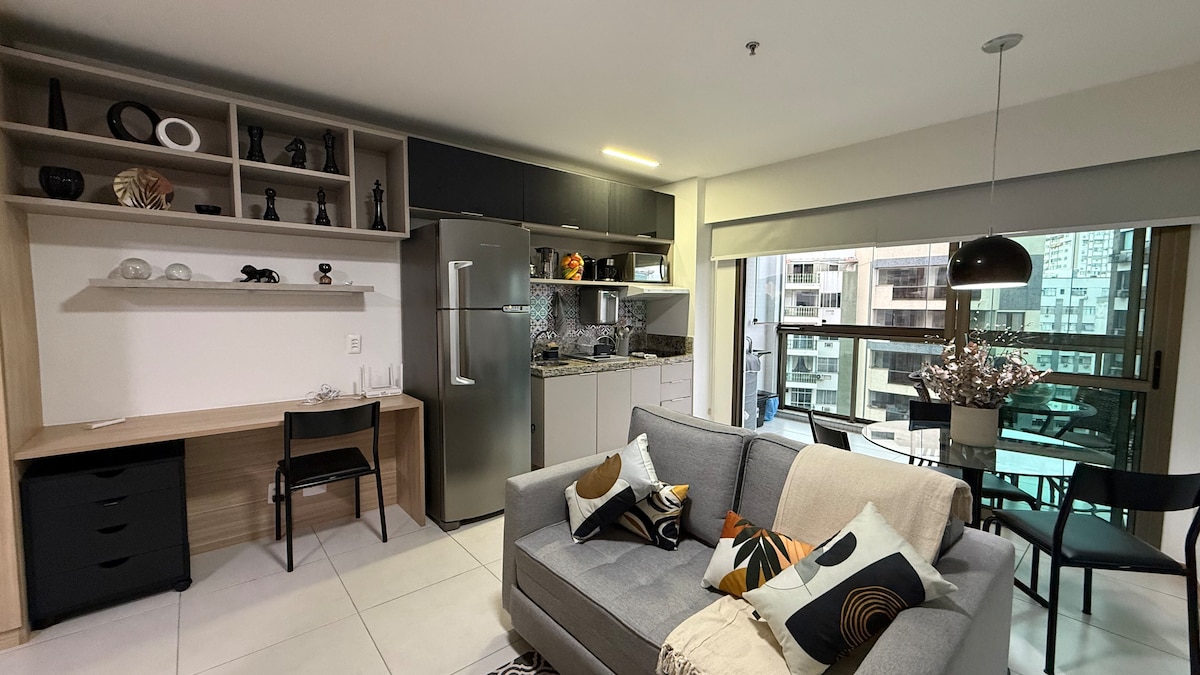 Studio novo, moderno e completo em Icaraí! Acomoda até 3 pessoas com conforto, com cama queen e sofá-cama. Possui Smart TV, Wi-Fi, ar-condicionado e cozinha equipada com micro-ondas, cafeteira e utensílios. O prédio oferece piscina, sauna, academia e bicicletário, além de portaria virtual 24h. Ambiente tranquilo, ideal para lazer ou trabalho, com decoração acolhedora e fácil acesso à praia, bares e pontos principais da cidade.