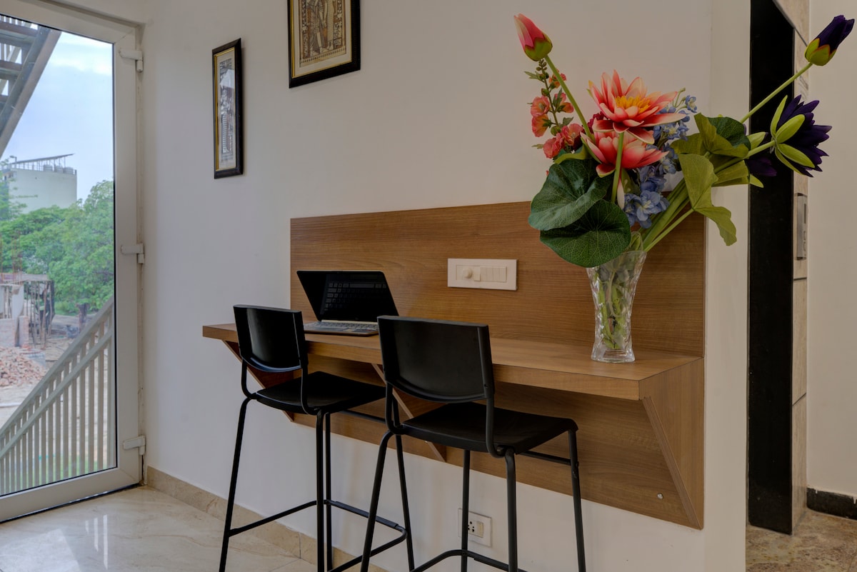 Deluxe Suite with Open Garden Terrace perfect for couples, family and corporate guests. Available for small parties, get togethers and reunions. We provide decorations on request. Walking distance from Ashram Metro (Pink Line). Located near New friends colony at Maharani Bagh Ring Road. Only 10 min Drive to Lajpat Nagar, Noida, Pragati Maidan, India Habitat Center, AIIMS, Akshardham Temple. Music system available for meetups and get togethers. Home cooked meals available.
