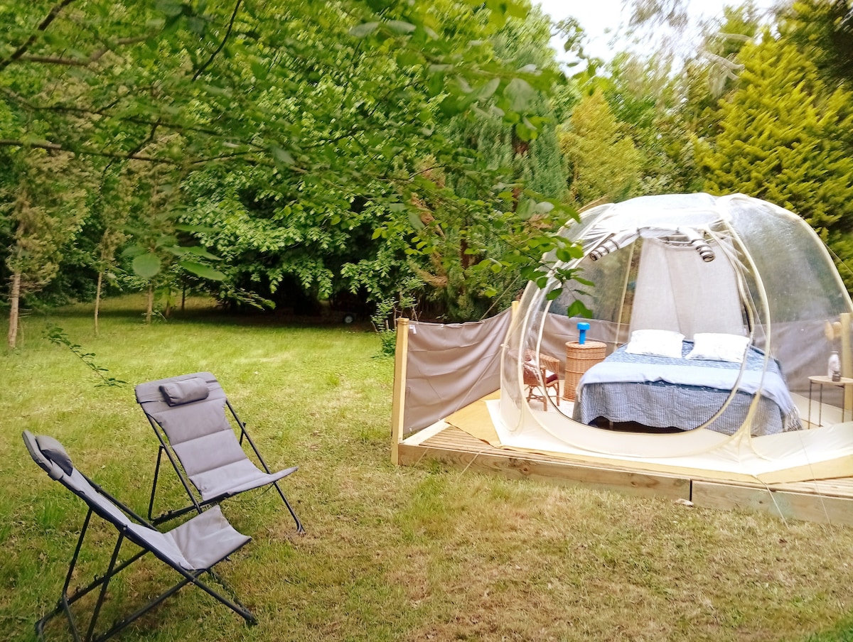 Bienvenue au Dôme Lune de La Canopée du Mont ! 🌙⭐️💫 Grand et Magnifique Dôme, fabrication française, très joliment décoré, Poêle à bois. 🪵 🔥 Chaleur assurée même en hiver ❄️ Romantisme à la campagne, au calme, à 26 km du Mont Saint-Michel et 45 minutes de Rennes. Options, tarif pour 2 personnes : - Séance de 45 minutes à l’Espace sauna : 45 euros - Séance d’1h de bain nordique : 59 € - Petit-déjeuner : 29 € - Accueil romantique : 55 euros